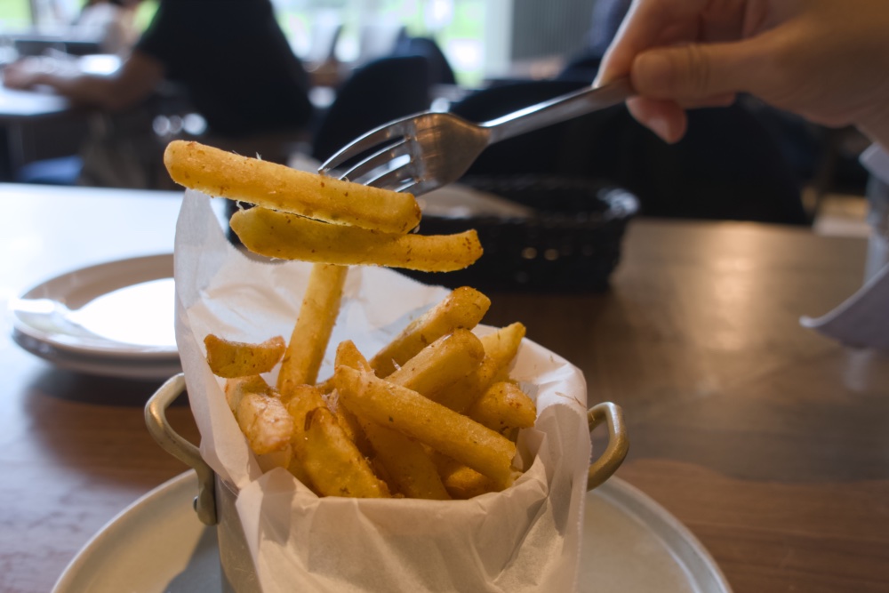 餐點方面都很好吃,薯條也炸得酥脆,咖啡則是較普通,但是在價位上,每位人均消費約500-600元,不算平價,但也不會太貴。份量上面,單份餐點一個人用餐又太多,兩人又太少,所以滿適合相互分食的點餐方式,單人造訪比較不大建議。